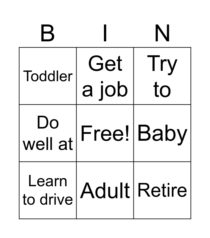 This bingo card has a free space and 25 words: Child, Elderly, Adult, Teenager, Retire, Toddler, Baby, Get a job, Get a degree, Get married, Buy a house, Go to university, Move house, Leave home, Learn to drive, Have children, Learn new things, Try to, Help people, Bring people together, Work hard, Make new friends, Work in a team, Do well at and Spend time with.