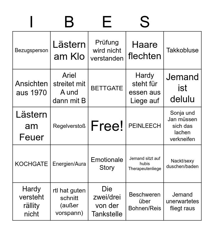This bingo card has a free space and 36 words: FAKT, DIE MASKEN FALLEN, Jemand spricht Gil auf sein gate an, Ariel streitet mit A und dann mit B, Jemand sitzt auf hubis Therapeutenliege, KOCHGATE, BETTGATE, Simone weiß alles Besser, Takkobluse, Tier im Camp, Regelverstoß, Haare flechten, SCHMUTZ, PEINLEECH, Jemand ist delulu, Bezugsperson, Hubi schnarcht, Energien/Aura, Jemand unerwartetes fliegt raus, Prüfung wird nicht verstanden, Sonja und Jan müssen sich das lachen verkneifen, Nackt/sexy duschen/baden, rtl hat guten schnitt (außer vorspann), Hardy versteht rällity nicht, Die zwei/drei von der Tankstelle, Lästern am Klo, Lästern am Feuer, Süßes Tier im Studio, Hardy steht für essen aus Liege auf, Ansichten aus 1970, Heldenreise, Sonja ist eine von uns, Beschweren über Bohnen/Reis, Emotionale Story, Sonja/jan macht bissigen Kommentar (im camp) and Jemand ist geschockt das Gil noch im camp ist.