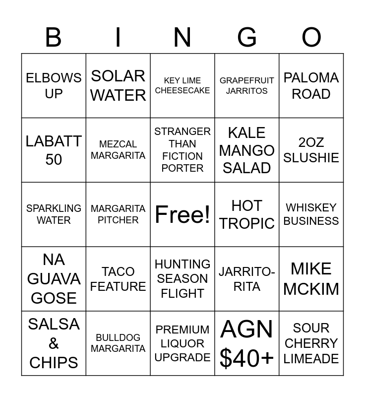 This bingo card has a free space and 27 words: JARRITO-RITA, SALMON CEVICHE, KALE MANGO SALAD, PREMIUM LIQUOR UPGRADE, LABATT 50, KEY LIME CHEESECAKE, SOLAR WATER, NA GUAVA GOSE, HOT TROPIC, MIKE MCKIM, SPARKLING WATER, GRAPEFRUIT JARRITOS, SALSA & CHIPS, BULLDOG MARGARITA, 2OZ SLUSHIE, HIGH CLASE FLIGHT, MEZCAL MARGARITA, STRANGER THAN FICTION PORTER, TACO FEATURE, ELBOWS UP, WHISKEY BUSINESS, AGN $40+, MARGARITA PITCHER, SOUR CHERRY LIMEADE, HUNTING SEASON FLIGHT, PALOMA ROAD and BUFFALO FACON CAULI.