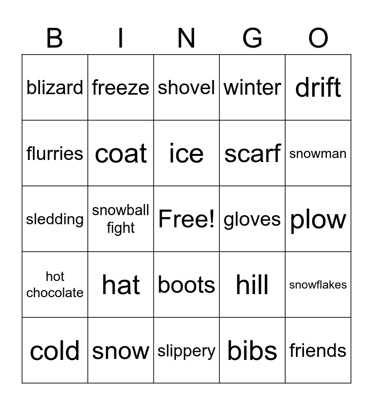 This bingo card has a free space and 24 words: hat, snow, ice, cold, drift, blizard, flurries, freeze, gloves, boots, scarf, sledding, hill, snowflakes, coat, bibs, plow, shovel, snowman, snowball fight, friends, hot chocolate, winter and slippery.