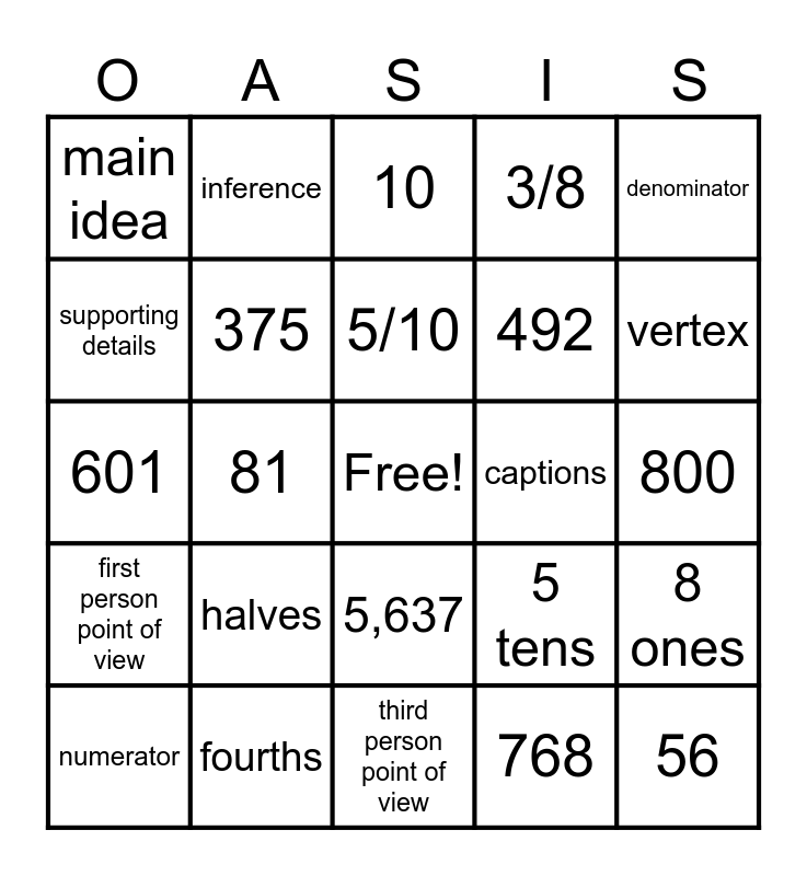 This bingo card has a free space and 24 words: halves, fourths, 5/10, numerator, denominator, main idea, supporting details, inference, captions, 5,637, 492, 601, 5 tens, 8 ones, 375, 768, 800, 10, vertex, 81, 56, first person point of view, 3/8 and third person point of view.
