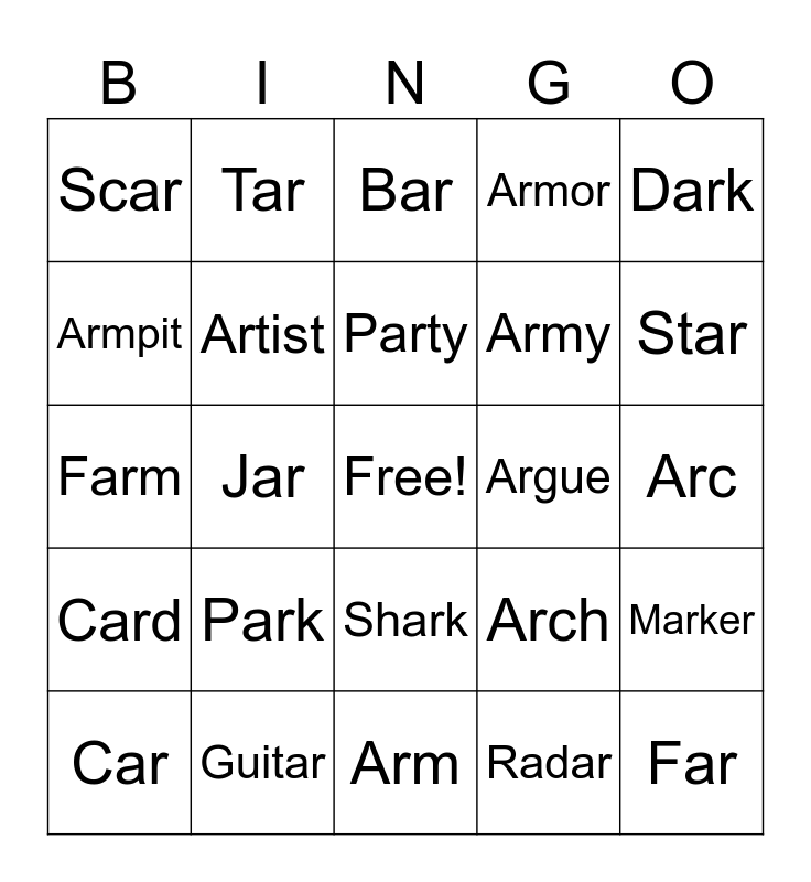 This bingo card has a free space and 24 words: Park, Guitar, Party, Car, Dark, Scar, Armpit, Tar, Argue, Shark, Army, Farm, Arch, Marker, Artist, Radar, Arc, Bar, Star, Jar, Far, Card, Armor and Arm.