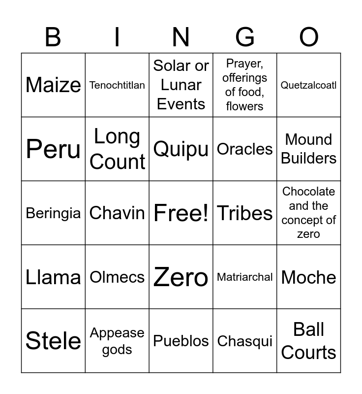 This bingo card has a free space and 34 words: Ceiba, Chasqui, Glyphs, Hopi, Llama, Long Count, Quetzalcoatl, Stele, Tenochtitlan, Tikal, Quipu, Solar or Lunar Events, Religious Beliefs, Totem Poles, Tribes, Mound Builders, Appease gods, Beringia, Olmecs, Matriarchal, Zero, Tepee, Maize, Chocolate and the concept of zero, Pueblos, Ball Courts, Prayer, offerings of food, flowers, 2600, Oracles, Peru, Andes, Chavin, Moche and Huari.