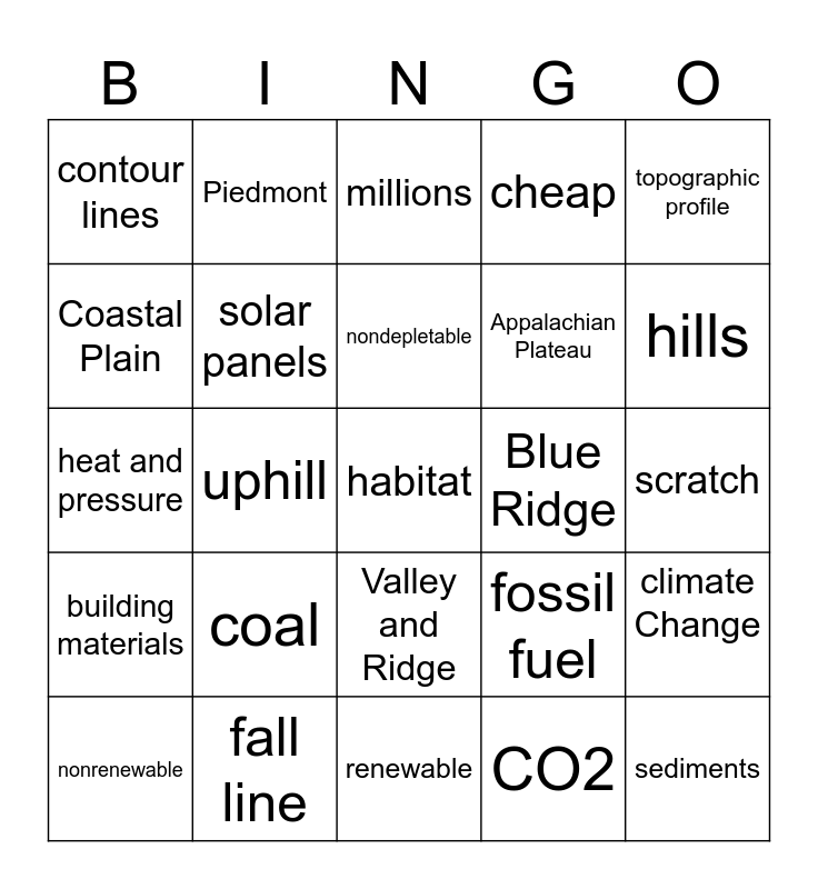 This bingo card has 25 words: coal, renewable, nondepletable, nonrenewable, topographic profile, contour lines, Coastal Plain, Piedmont, Blue Ridge, Valley and Ridge, Appalachian Plateau, heat and pressure, fossil fuel, climate Change, solar panels, sediments, scratch, millions, hills, uphill, habitat, fall line, building materials, cheap and CO2.