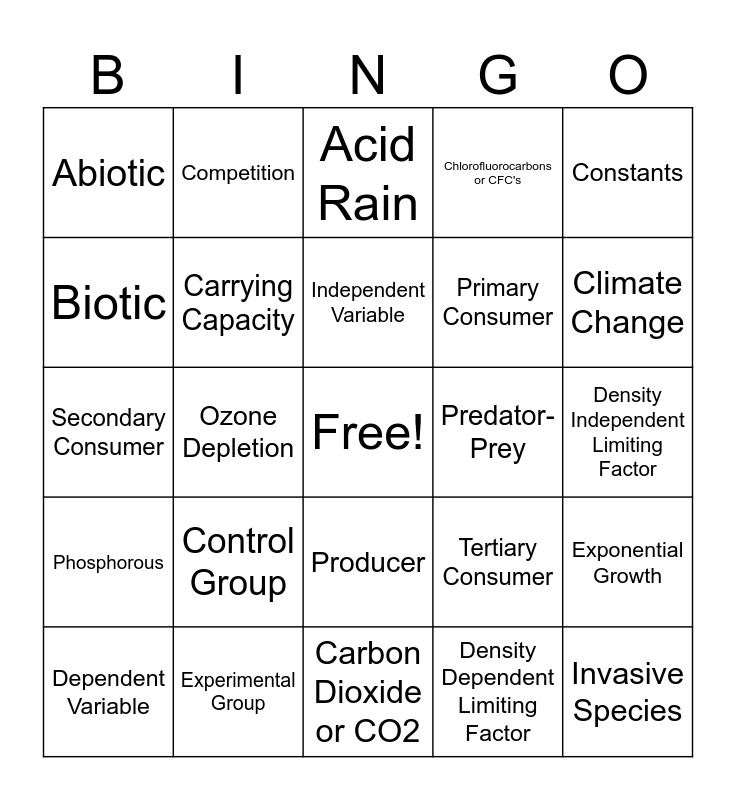 This bingo card has a free space and 24 words: Control Group, Experimental Group, Independent Variable, Dependent Variable, Constants, Abiotic, Biotic, Competition, Predator- Prey, Producer, Primary Consumer, Secondary Consumer, Tertiary Consumer, Exponential Growth, Carrying Capacity, Density Dependent Limiting Factor, Density Independent Limiting Factor, Acid Rain, Climate Change, Ozone Depletion, Invasive Species, Phosphorous, Chlorofluorocarbons or CFC's and Carbon Dioxide or CO2.