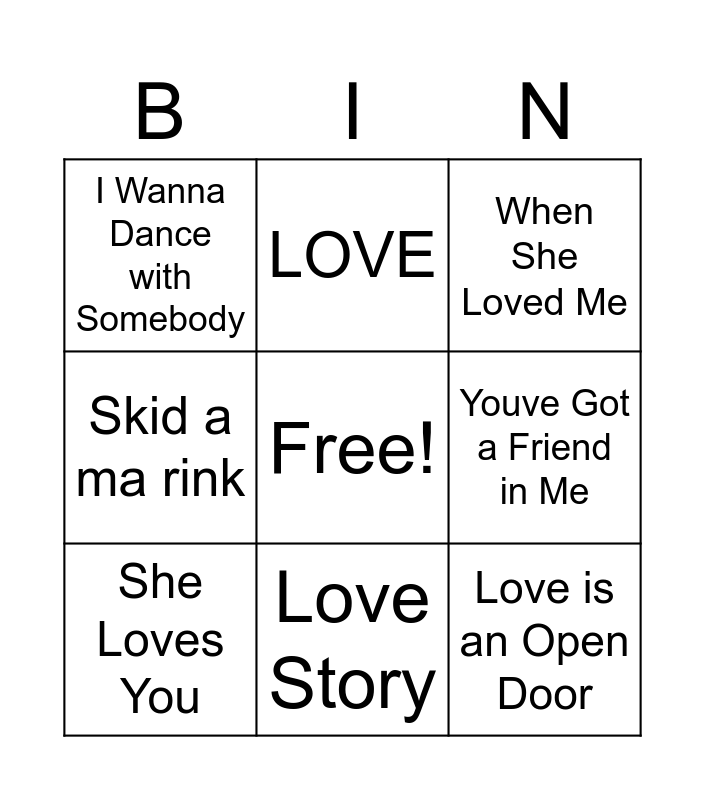 This bingo card has a free space and 8 words: Youve Got a Friend in Me, When She Loved Me, LOVE, She Loves You, I Wanna Dance with Somebody, Love is an Open Door, Skid a ma rink and Love Story.
