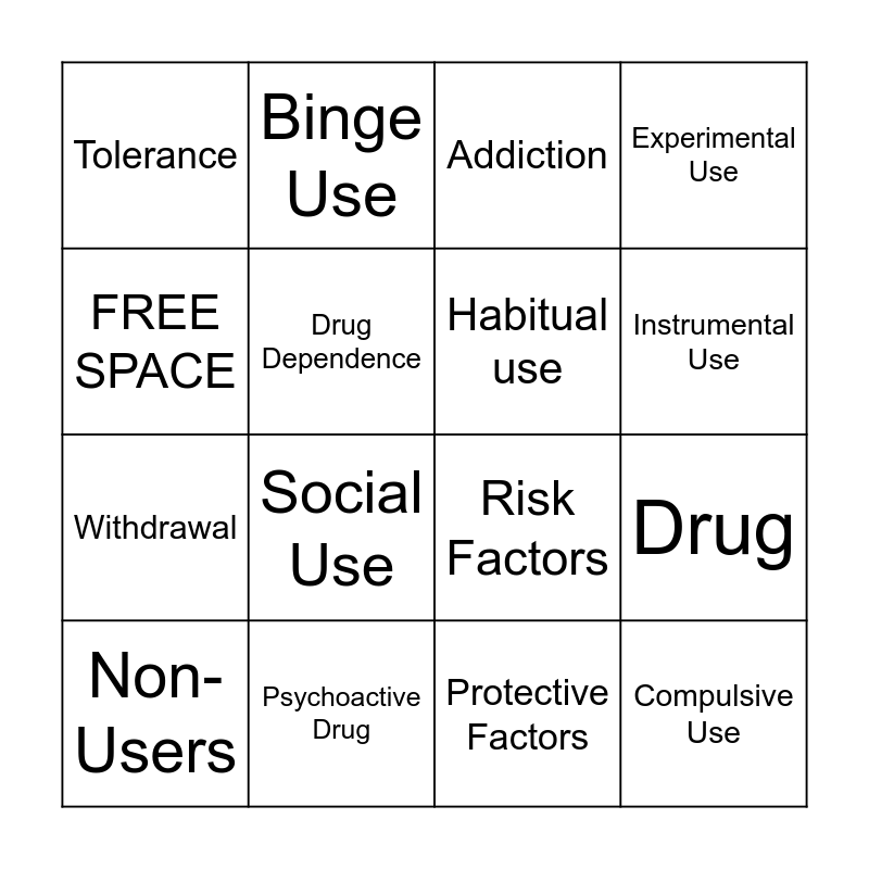 This bingo card has 16 words: Psychoactive Drug, Drug, Addiction, Tolerance, Withdrawal, Binge Use, Risk Factors, Protective Factors, FREE SPACE, Drug Dependence, Non-Users, Experimental Use, Social Use, Instrumental Use, Habitual use and Compulsive Use.