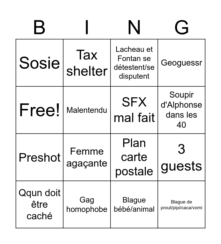 This bingo card has 16 words: Gag homophobe, 3 guests, Lacheau et Fontan se détestent/se disputent, Sosie, Preshot, Tax shelter, Plan carte postale, Blague bébé/animal, Free!, Malentendu, Qqun doit être caché, Geoguessr, Femme agaçante, Soupir d'Alphonse dans les 40, SFX mal fait and Blague de prout/pipi/caca/vomi.