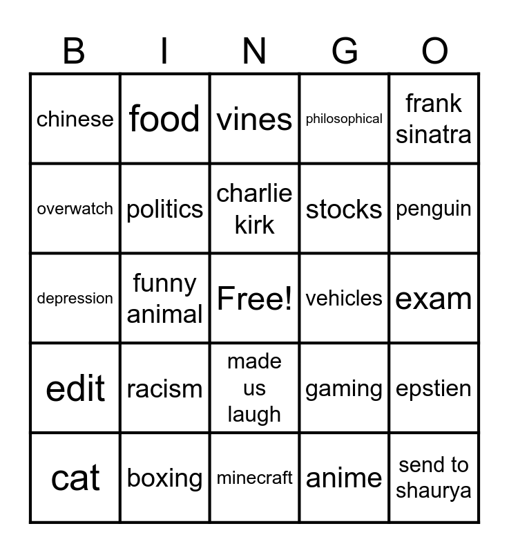 This bingo card has a free space and 24 words: cat, racism, charlie kirk, anime, frank sinatra, chinese, food, vines, vehicles, exam, depression, politics, gaming, epstien, overwatch, boxing, minecraft, philosophical, penguin, edit, funny animal, made us laugh, stocks and send to shaurya.