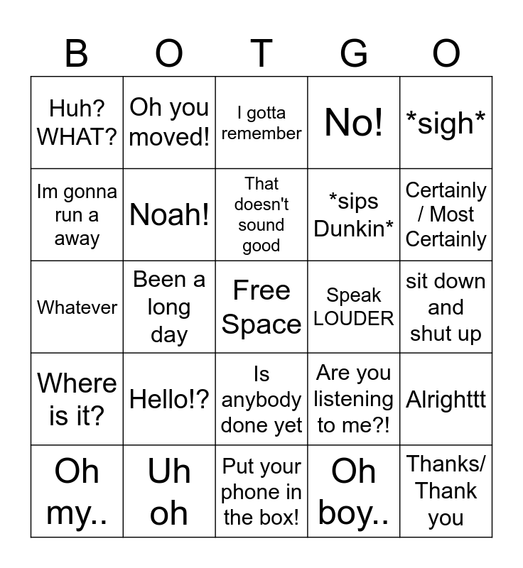 This bingo card has a free space and 24 words: Hello!?, Uh oh, That doesn't sound good, Oh my.., *sigh*, Huh? WHAT?, Im gonna run a away, Oh you moved!, Speak LOUDER, Is anybody done yet, *sips Dunkin*, Whatever, Are you listening to me?!, Alrighttt, Noah!, Oh boy.., sit down and shut up, I gotta remember, Certainly / Most Certainly, Been a long day, Thanks/ Thank you, Where is it?, No! and Put your phone in the box!.