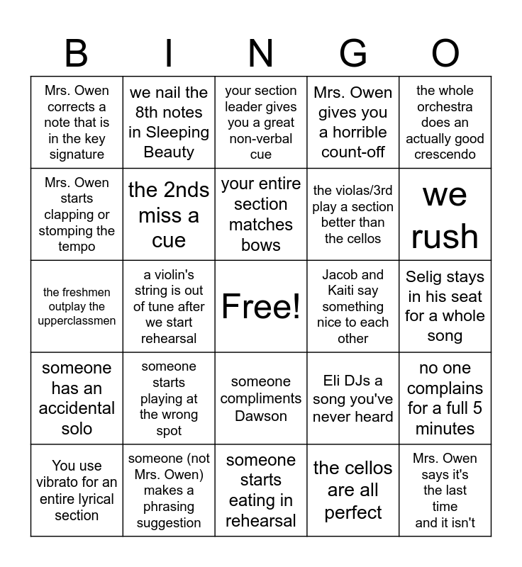 This bingo card has a free space and 39 words: you play a flatted accidental correctly, you play a sharped accidental correctly, someone needs a pencil when Mrs. Owen asks you to mark something, the 2nds miss a cue, You use vibrato for an entire lyrical section, someone compliments Dawson, your entire section matches bows, a passage sounded better the second time we run it, the whole orchestra does an actually good crescendo, someone has an accidental solo, a violin's string is out of tune after we start rehearsal, Mrs. Owen gives you a horrible count-off, Mrs. Owen says it's the last time and it isn't, Selig stays in his seat for a whole song, Jacob and Kaiti say something nice to each other, someone starts playing at the wrong spot, you break a bow hair, Mrs. Owen corrects a note that is in the key signature, Mrs. Owen's neck vain pops, Eli DJs a song you've never heard, Mrs. Owen starts clapping or stomping the tempo, someone starts eating in rehearsal, the violas/3rd play a section better than the cellos, we rush, someone starts ripping Dragon Hunter, someone says the word superior, Granite answers a music theory question, someone pays a genuine compliment to the 3rds/violas, the 1sts act like main characters, we nail the 8th notes in Sleeping Beauty, someone uses the word Fugue correctly, Kai and Cortland keep their roller chairs still for an entire piece, your section leader gives you a great non-verbal cue, someone (not Mrs. Owen) makes a phrasing suggestion, the cellos are all perfect, you play something in 3rd position, no one complains for a full 5 minutes, the freshmen outplay the upperclassmen and Mrs. Owen yells louder when everyone is already at ff.