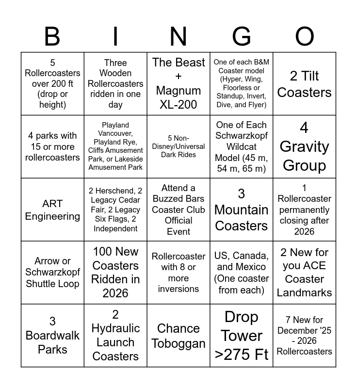 This bingo card has a free space and 24 words: 100 New Coasters Ridden in 2026, 2 Hydraulic Launch Coasters, 5 Non-Disney/Universal Dark Rides, 3 Boardwalk Parks, 2 Tilt Coasters, 5 Rollercoasters over 200 ft (drop or height), 4 parks with 15 or more rollercoasters, Three Wooden Rollercoasters ridden in one day, 3 Mountain Coasters, Rollercoaster with 8 or more inversions, One of Each Schwarzkopf Wildcat Model (45 m, 54 m, 65 m), ART Engineering, US, Canada, and Mexico (One coaster from each), 2 New for you ACE Coaster Landmarks, Playland Vancouver, Playland Rye, Cliffs Amusement Park, or Lakeside Amusement Park, Drop Tower >275 Ft, 1 Rollercoaster permanently closing after 2026, The Beast + Magnum XL-200, 4 Gravity Group, 2 Herschend, 2 Legacy Cedar Fair, 2 Legacy Six Flags, 2 Independent, 7 New for December '25 - 2026 Rollercoasters, Arrow or Schwarzkopf Shuttle Loop, One of each B&M Coaster model (Hyper, Wing, Floorless or Standup, Invert, Dive, and Flyer) and Chance Toboggan.