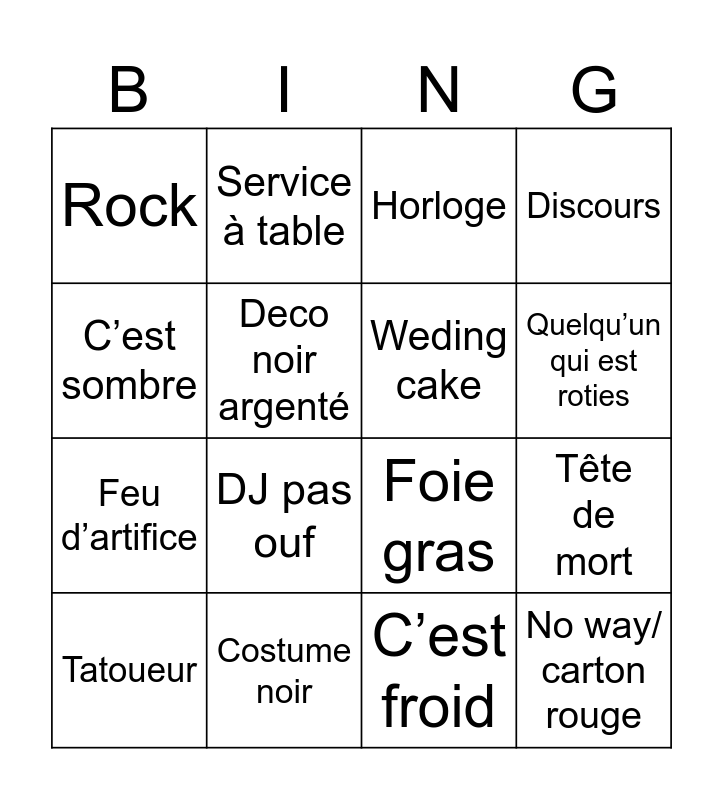 This bingo card has 16 words: Costume noir, Tête de mort, Horloge, Rock, Feu d’artifice, Service à table, Foie gras, C’est froid, C’est sombre, Deco noir argenté, Tatoueur, Discours, DJ pas ouf, Quelqu’un qui est roties, Weding cake and No way/ carton rouge.