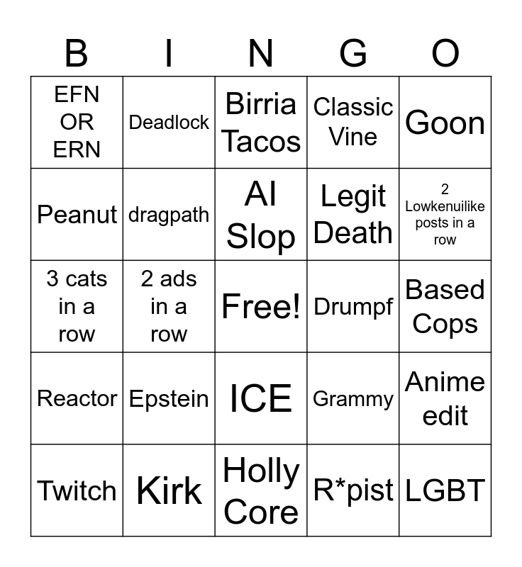 This bingo card has a free space and 24 words: Epstein, Kirk, AI Slop, Twitch, Goon, EFN OR ERN, Peanut, Deadlock, Drumpf, ICE, Legit Death, 3 cats in a row, Grammy, Anime edit, dragpath, R*pist, Based Cops, Birria Tacos, 2 Lowkenuilike posts in a row, 2 ads in a row, LGBT, Reactor, Classic Vine and Holly Core.