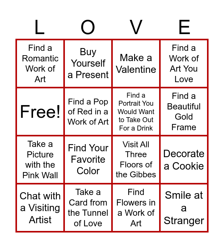 This bingo card has 16 words: Take a Card from the Tunnel of Love, Decorate a Cookie, Make a Valentine, Find a Romantic Work of Art, Take a Picture with the Pink Wall, Buy Yourself a Present, Visit All Three Floors of the Gibbes, Find Flowers in a Work of Art, Free!, Find a Pop of Red in a Work of Art, Chat with a Visiting Artist, Find a Work of Art You Love, Find Your Favorite Color, Find a Beautiful Gold Frame, Find a Portrait You Would Want to Take Out For a Drink and Smile at a Stranger.