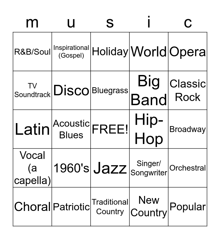 This bingo card has a free space and 24 words: 1960's, Patriotic, Bluegrass, Choral, Opera, R&B/Soul, TV Soundtrack, Inspirational (Gospel), Hip-Hop, Jazz, Big Band, Latin, Singer/ Songwriter, Orchestral, Disco, New Country, Broadway, Holiday, Classic Rock, Acoustic Blues, Popular, Vocal (a capella), World and Traditional Country.