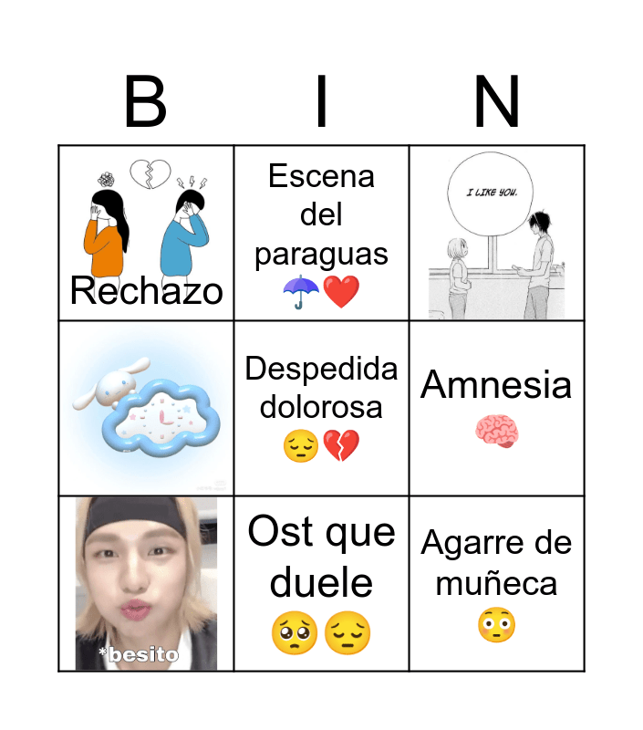 This bingo card has 4 images, a free space and 5 words: Amnesia 🧠, Escena del paraguas ☂️❤️, Rechazo, Agarre de muñeca 😳 and Ost que duele 🥺😔.