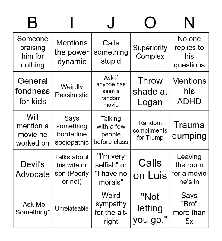 This bingo card has 25 words: Talks about his wife or son (Poorly or not), Weird sympathy for the alt-right, Ask if anyone has seen a random movie, "Ask Me Something", No one replies to his questions, Someone praising him for nothing, General fondness for kids, Mentions the power dynamic, Random compliments for Trump, "I'm very selfish" or "I have no morals", Throw shade at Logan, Will mention a movie he worked on, Calls on Luis, Leaving the room for a movie he's in, Weirdly Pessimistic, Says "Bro" more than 5x, Trauma dumping, Calls something stupid, Mentions his ADHD, Says something borderline sociopathic, Talking with a few people before class, Unrelateable, Devil's Advocate, Superiority Complex and "Not letting you go.".