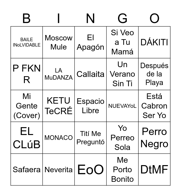 This bingo card has a free space and 24 words: MONACO, Neverita, Callaita, Safaera, DÁKITI, BAILE INoLVIDABLE, P FKN R, Moscow Mule, NUEVAYoL, Tití Me Preguntó, Un Verano Sin Ti, Mi Gente (Cover), Yo Perreo Sola, Perro Negro, LA MuDANZA, Me Porto Bonito, Está Cabron Ser Yo, El Apagón, Después de la Playa, KETU TeCRÉ, DtMF, EL CLúB, Si Veo a Tu Mamá and EoO.