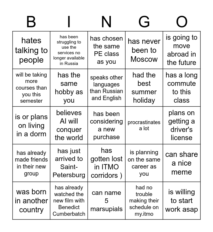 This bingo card has 25 words: has just arrived to Saint-Petersburg, can name 5 marsupials, speaks other languages than Russian and English, was born in another country, is going to move abroad in the future, hates talking to people, will be taking more courses than you this semester, has been struggling to use the services no longer available in Russia, procrastinates a lot, has gotten lost in ITMO corridors ), had the best summer holiday, is or plans on living in a dorm, is planning on the same career as you, can share a nice meme, has the same hobby as you, is willing to start work asap, plans on getting a driver's license, has chosen the same PE class as you, has a long commute to this class, believes AI will conquer the world, has been considering a new purchase, has already watched the new film with Benedict Cumberbatch, has already made friends in their new group, has never been to Moscow and had no trouble making their schedule on my.itmo.