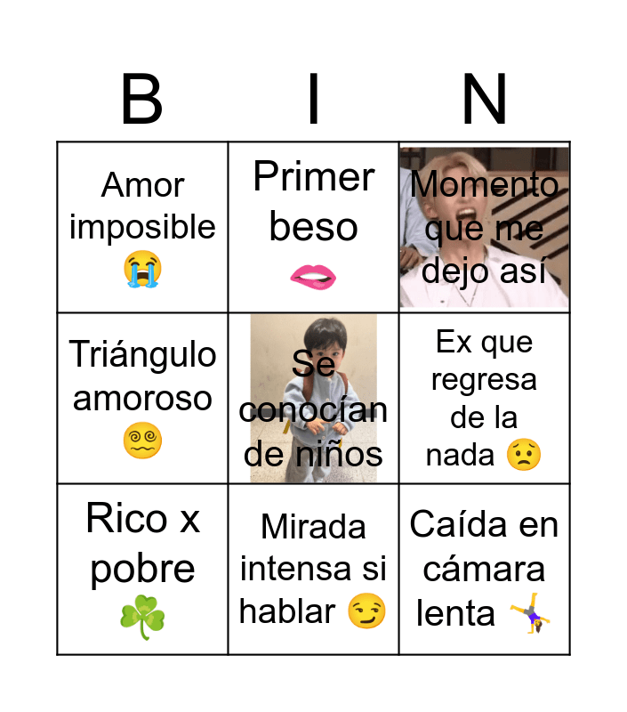 This bingo card has 1 images, a free space and 8 words: Ex que regresa de la nada 😟, Momento que me dejo así, Primer beso 🫦, Rico x pobre ☘️, Amor imposible 😭, Caída en cámara lenta 🤸♀️, Triángulo amoroso 😵💫 and Mirada intensa si hablar 😏.