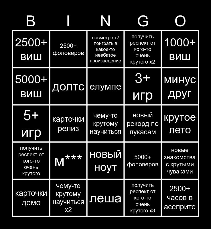 This bingo card has 25 words: м***, леша, елумпе, карточки демо, 1000+ виш, 2500+ виш, 5000+ виш, 2500+ фоловеров, новый рекорд по лукасам, новый ноут, 3+ игр, 5+ игр, 5000+ фоловеров, новые знакомства с крутыми чуваками, долтс, 2500+ часов в асеприте, крутое лето, посмотреть/поиграть в какое-то неебатое произведение, минус друг, карточки релиз, чему-то крутому научиться, чему-то крутому научиться x2, получить респект от кого-то очень крутого, получить респект от кого-то очень крутого x2 and получить респект от кого-то очень крутого x3.