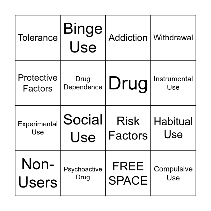 This bingo card has 16 words: Psychoactive Drug, Habitual Use, Addiction, Tolerance, Experimental Use, Binge Use, Risk Factors, FREE SPACE, Protective Factors, Drug Dependence, Non-Users, Withdrawal, Social Use, Instrumental Use, Drug and Compulsive Use.