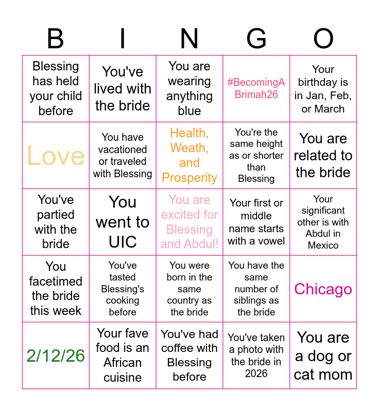 This bingo card has a free space and 30 words: Your fave food is an African cuisine, You are over the age of 30, You went to UIC, You have a piercing that's not on your ear, Blessing has held your child before, You are wearing anything blue, You have vacationed or traveled with Blessing, You were born in the same country as the bride, Your first or middle name starts with a vowel, You've had coffee with Blessing before, Your significant other is with Abdul in Mexico, You are a dog or cat mom, You've taken a photo with the bride in 2026, You have a tattoo, You are related to the bride, You've been on a bridal train with Blessing in the past, You have the same number of siblings as the bride, You facetimed the bride this week, You've tasted Blessing's cooking before, Your birthday is in Jan, Feb, or March, You've partied with the bride, You've watched anime with Blessing, You've lived with the bride, You're the same height as or shorter than Blessing, Love, #BecomingA Brimah26, Chicago, 2/12/26, Health, Weath, and Prosperity and Marriage.