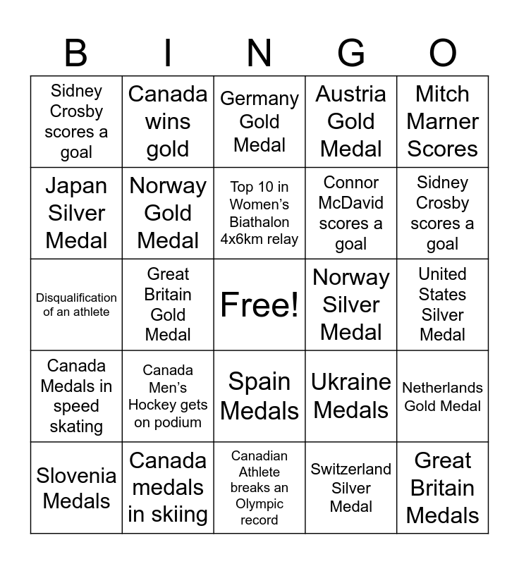 This bingo card has a free space and 137 words: Bobsled time by Canadian Team under XXXX, Disqualification of an athlete, Canada wins gold, Canada wins silver, Canada wins bronze, Connor McDavid scores a goal, Canadian Athlete breaks an Olympic record, Estonia Medals, Latvia Medals, Poland Medals, Ukraine Medals, Spain Medals, Slovakia Gold Medal, Belgium Gold Medal, Czech Republic Gold Medal, Hungary Gold Medal, Great Britain Gold Medal, Australia Gold Medal, Marie-Philip Poulin scores a goal, Sarah Nurse Scores a goal, Brianne Jenner scores a goal, Natalie Spooners Scores a goal, Sidney Crosby scores a goal, Macklin Celebrini Scores, Brad Marchand Scores, Mitch Marner Scores, Canada Mens Hockey gets on podium, Canada Womens Hockey gets on podium, Canada Womens Curling Team Homan gets on podium, Canada Mens Curling Team Jacobs gets on podium, Canada Medals in speed skating, Canada medals in skiing, Willliam Dandjinou medals in short track speed skating, Steven Dubois medals in short track speed skating, Courtney Sarault medals in short track speed skating 1000m, Mikael Kingsbury medals in freestyle skiing, Reece Howden medals in freestyle skiing, Megan Oldham medals in freestyle skiing, Canada makes top 5 in Luge Team Relay, Ski Mountaineering Place Top 10, Top 10 in Women’s Biathalon 4x6km relay, Top 10 in Men’s Biathalon 10km sprint, Bobsled time by Canadian Team under XXXX, Canada medals in Women’s Bobsleigh/Skeleton, Canada medals in Men’s Bobsleigh/Skeleton, Canada Medals in Womens Cross Country Skiing, Canada Medals in Mens Cross Country Skiing, Disqualification of an athlete, Canada wins gold, Canada wins silver, Canada wins bronze, Connor McDavid scores a goal, Connor McDavid has an assist, Leon Draisaitle Scores, Canadian Athlete breaks an Olympic record, Canada Medals, Republic of Korea Gold Medal, Republic of Korea Silver Medal, Republic of Korea Bronze Medal, Slovenia Medals, Finland Gold Medal, Finland Silver Medal, Finland Bronze, New Zealand Medals, Australia Medals, Great Britain Medals, Hungary Medals, Belgium Medals, Czech Republic Medals, Slovakia Medals, Belarus Medals, Spain Medals, Ukraine Medals, Estonia Medals, Latvia Medals, Poland Medals, Norway Gold Medal, Norway Silver Medal, Norway Bronze Medal, Germany Gold Medal, Germany Silver Medal, Germany Bronze Medal, China Gold Medal, China Silver Medal, China Bronze Medal, United States Gold Medal, United States Silver Medal, United States Bronze Medal, Sweden Gold Medal, Sweden Silver Medal, Sweden Bronze Medal, Netherlands Gold Medal, Netherlands Silver Medal, Netherlands Bronze Medal, Austria Gold Medal, Austria Silver Medal, Austria Bronze Medal, Switzerland Gold Medal, Switzerland Silver Medal, Switzerland Bronze Medal, France Gold Medal, France Silver Medal, France Bronze, Japan Gold Medal, Japan Silver Medal, Japan Bronze Medal, Italy Gold Medal, Italy Silver Medal, Italy Bronze Medal, Marie-Philip Poulin scores a goal, Sarah Nurse Scores a goal, Brianne Jenner scores a goal, Natalie Spooners Scores a goal, Sidney Crosby scores a goal, Sidney Crosby has an assist, Macklin Celebrini Scores, Brad Marchand Scores, Mitch Marner Scores, Canada Men’s Hockey gets on podium, Canada Women’s Hockey gets on podium, Canada Women’s Curling Team Homan gets on podium, Canada Men’s Curling Team Jacobs gets on podium, Canada Medals in speed skating, Canada medals in skiing, Willliam Dandjinou medals in short track speed skating, Steven Dubois medals in short track speed skating, Courtney Sarault medals in short track speed skating 1000m, Mikael Kingsbury medals in freestyle skiing, Reece Howden medals in freestyle skiing, Megan Oldham medals in freestyle skiing, Canada makes top 5 in Luge Team Relay, Canadian Ski Mountaineering Place Top 10, Canadian Top 10 in Women’s Biathalon 4x6km relay, Canadian Top 10 in Men’s Biathalon 10km sprint, Canada gets on podium for Men’s Snowboarding, Canada gets on podium for Women’s Snowboarding and Canada gets on podium for Figure Skating.