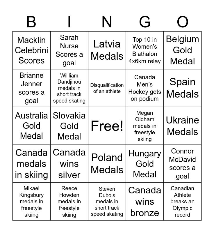 This bingo card has a free space and 42 words: Bobsled time by Canadian Team under XXXX, Disqualification of an athlete, Canada wins gold, Canada wins silver, Canada wins bronze, Connor McDavid scores a goal, Canadian Athlete breaks an Olympic record, Estonia Medals, Latvia Medals, Poland Medals, Ukraine Medals, Spain Medals, Slovakia Gold Medal, Belgium Gold Medal, Czech Republic Gold Medal, Hungary Gold Medal, Great Britain Gold Medal, Australia Gold Medal, Marie-Philip Poulin scores a goal, Sarah Nurse Scores a goal, Brianne Jenner scores a goal, Natalie Spooners Scores a goal, Sidney Crosby scores a goal, Macklin Celebrini Scores, Brad Marchand Scores, Mitch Marner Scores, Canada Men’s Hockey gets on podium, Canada Women’s Hockey gets on podium, Canada Women’s Curling Team Homan gets on podium, Canada Men’s Curling Team Jacobs gets on podium, Canada Medals in speed skating, Canada medals in skiing, Willliam Dandjinou medals in short track speed skating, Steven Dubois medals in short track speed skating, Courtney Sarault medals in short track speed skating 1000m, Mikael Kingsbury medals in freestyle skiing, Reece Howden medals in freestyle skiing, Megan Oldham medals in freestyle skiing, Canada makes top 5 in Luge Team Relay, Ski Mountaineering Place Top 10, Top 10 in Women’s Biathalon 4x6km relay and Top 10 in Men’s Biathalon 10km sprint.