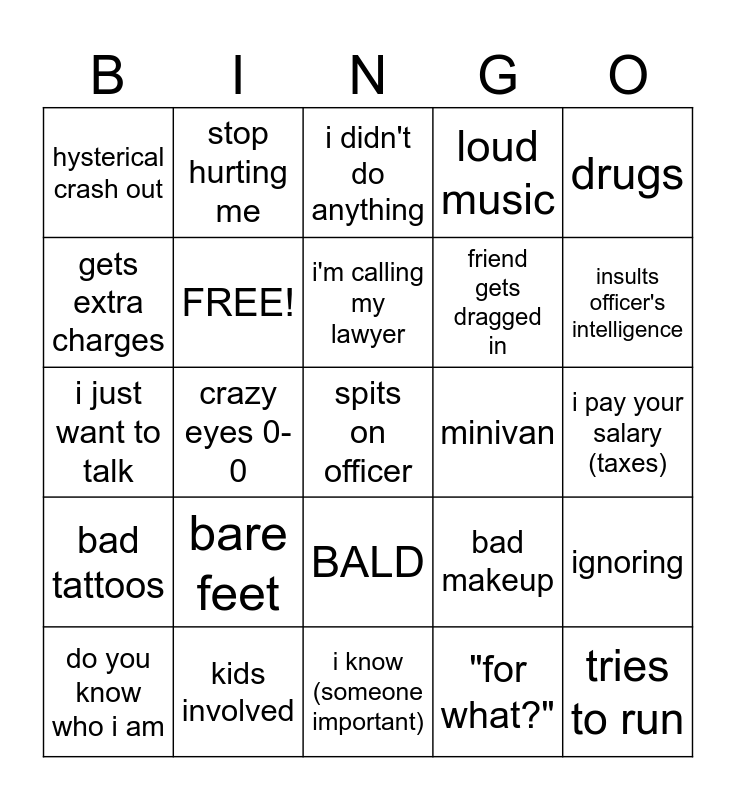 This bingo card has 45 words: neon clothes, spits on officer, i know my rights, do you know who i am, kicks officer, "for what?", i didn't do anything, alchohol, drugs, kids involved, loud music, minivan, BALD, bare feet, tiktok brainrot ref, i know (someone important), call supervisor, i just want to talk, insults officer physically, insults officer's intelligence, stop hurting me, it hurts, i can't breath, hysterical crash out, said something racist, i pay your salary (taxes), GETS TAZED, small dog, bad makeup, bad tattoos, tries to walk away, ignoring, act like an adult (from officer), act like an adult (from person), karen hair, crazy eyes 0-0, random singing, pees or poos, tries to run, i'm calling my lawyer, gets extra charges, friend gets dragged in, family gets involved, FREE! and i'm recording this (or pulls out phone to record too).