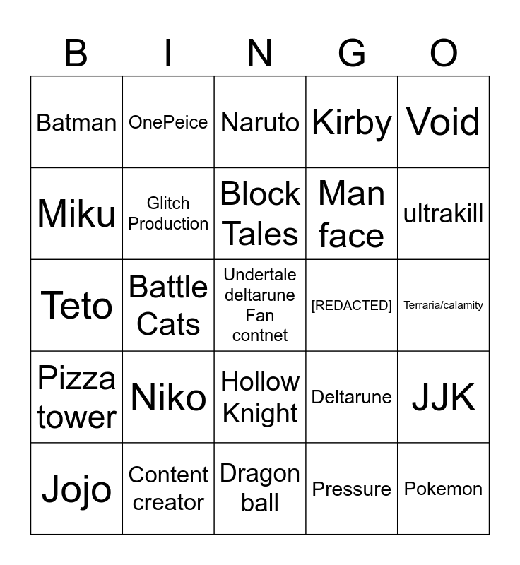 This bingo card has 25 words: Niko, Dragon ball, Block Tales, Jojo, Void, Batman, Miku, OnePeice, [REDACTED], Hollow Knight, Man face, Teto, Deltarune, JJK, Glitch Production, Pokemon, Terraria/calamity, Naruto, ultrakill, Battle Cats, Undertale deltarune Fan contnet, Content creator, Pizza tower, Kirby and Pressure.