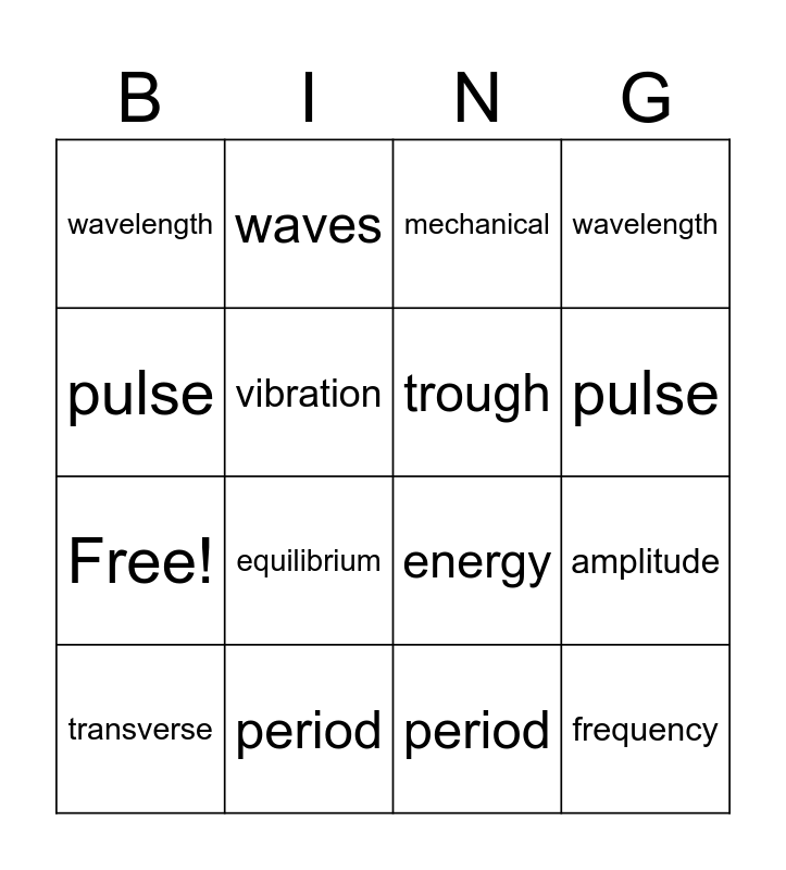This bingo card has 20 words: amplitude, oscillation, mechanical, crest, transverse, pulse, period, wavelength, Free!, waves, equilibrium, energy, vibration, frequency, trough, medium, pulse, wavelength, period and trough.