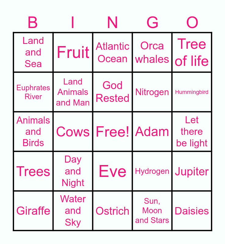 This bingo card has a free space and 24 words: Day and Night, Water and Sky, God Rested, Giraffe, Tree of life, Land and Sea, Euphrates River, Fruit, Adam, Eve, Nitrogen, Animals and Birds, Hydrogen, Jupiter, Land Animals and Man, Sun, Moon and Stars, Let there be light, Atlantic Ocean, Hummingbird, Cows, Daisies, Trees, Orca whales and Ostrich.