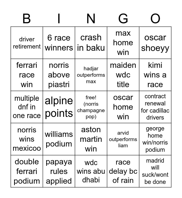This bingo card has a free space and 24 words: williams podium, papaya rules applied, hadjar outperforms max, double ferrari podium, oscar shoeyy, driver retirement, ferrari race win, 6 race winners, oscar home win, aston martin win, maiden wdc title, multiple dnf in one race, arvid outperforms liam, george home win/norris podium, norris above piastri, race delay bc of rain, contract renewal for cadillac drivers, crash in baku, kimi wins a race, alpine points, madrid will suck/wont be done, norris wins mexicoo, max home win and wdc wins abu dhabi.