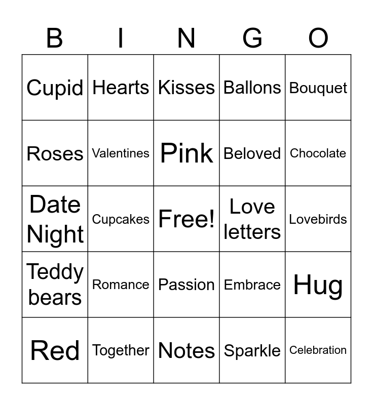 This bingo card has a free space and 24 words: Romance, Together, Pink, Red, Bouquet, Cupid, Roses, Hearts, Love letters, Passion, Beloved, Date Night, Embrace, Hug, Valentines, Sparkle, Lovebirds, Kisses, Chocolate, Cupcakes, Celebration, Teddy bears, Ballons and Notes.