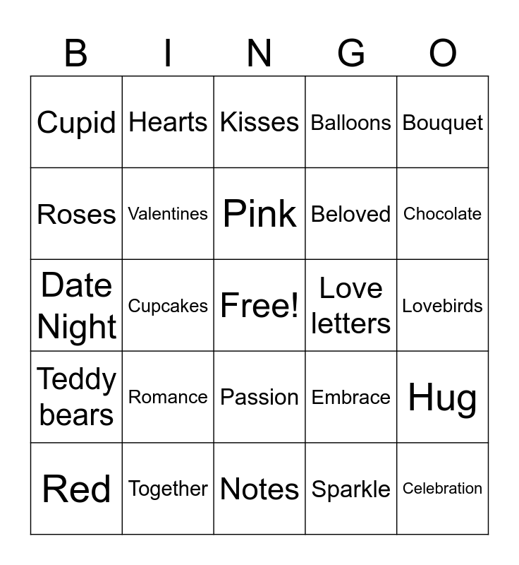 This bingo card has a free space and 24 words: Romance, Together, Pink, Red, Bouquet, Cupid, Roses, Hearts, Love letters, Passion, Beloved, Date Night, Embrace, Hug, Valentines, Sparkle, Lovebirds, Kisses, Chocolate, Cupcakes, Celebration, Teddy bears, Balloons and Notes.