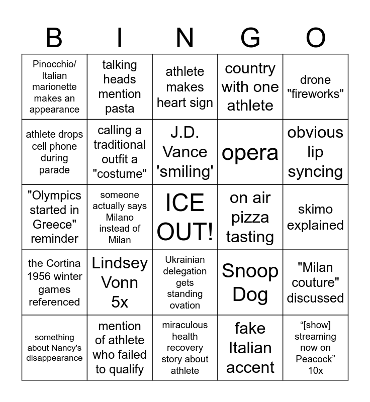 This bingo card has a free space and 24 words: Lindsey Vonn 5x, mention of athlete who failed to qualify, J.D. Vance 'smiling', something about Nancy's disappearance, drone "fireworks", Pinocchio/ Italian marionette makes an appearance, athlete drops cell phone during parade, talking heads mention pasta, on air pizza tasting, Ukrainian delegation gets standing ovation, opera, "Olympics started in Greece" reminder, Snoop Dog, "Milan couture" discussed, calling a traditional outfit a "costume", fake Italian accent, skimo explained, athlete makes heart sign, obvious lip syncing, someone actually says Milano instead of Milan, “[show] streaming now on Peacock” 10x, the Cortina 1956 winter games referenced, country with one athlete and miraculous health recovery story about athlete.