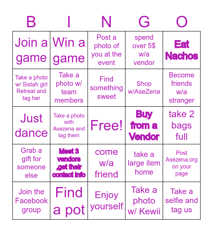 This bingo card has a free space and 34 words: Donate to win a prize, Take a photo w/ Kewii, Follow us on Instagram, Fill up a bag, Grab a gift for someone else, Take a photo w/ team members, Eat Nachos, Join the Facebook group, Win a game, Join our contact list, Find something sweet, Post a photo of you at the event, Find a purse, Meet a new Friend, Buy from a Vendor, Become friends w/a stranger, Find a pot, Just dance, Meet 3 vendors ,get their contact info, take a large item home, come w/a friend, Dance w/a stranger, Join a game, take 2 bags full, Enjoy yourself, Take a selfie and tag us, spend over 5$ w/a vendor, Spend $20 w/a vendor, Shop w/AseZena, Take a photo w/ Sistah girl Retreat and tag her, Join 5 Facebook Events, Take a photo with Asezena and tag them, Post Asezena,org on your page and Get on the mic and tell eveyone your enjoying your day.