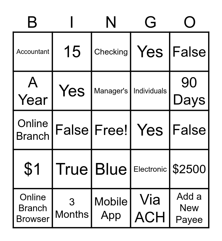 This bingo card has a free space and 27 words: Electronic, Electronic, Individuals, Mobile App, A Year, Checking, 15, $1, Yes, $2500, Online Branch, Yes, Online Branch Browser, 3 Months, 90 Days, After a Specific # of Payments, Yes, Manager's, True, Accountant, False, Via ACH, False, Add a New Payee, Blue, False and Contact Center Team Lead.