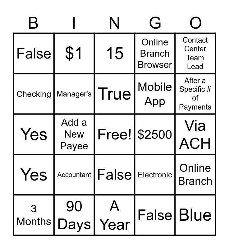 This bingo card has a free space and 27 words: Electronic, Individuals, Mobile App, A Year, Checking, 15, $1, Yes, $2500, Online Branch, Yes, Online Branch Browser, 3 Months, 90 Days, After a Specific # of Payments, Yes, Manager's, True, Accountant, False, Via ACH, False, Add a New Payee, Blue, False, Contact Center Team Lead and Electronic.