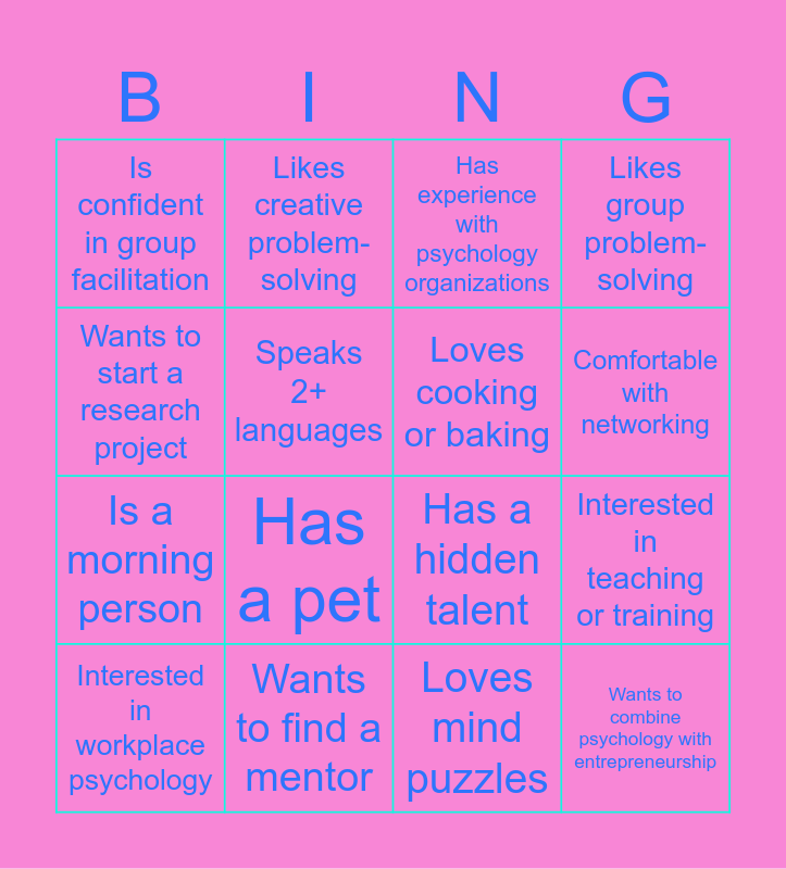 This bingo card has 111 words: Free!, Interested in clinical psychology, Interested in organizational psychology, Interested in neuropsychology, Interested in educational psychology, Interested in research careers, Considering a PhD, Has completed an internship, Has done a master’s thesis abroad, Wants to start their own practice, Has worked in a clinical setting, Has worked in an educational setting, Has worked in a research lab, Wants to work with children or adolescents, Wants to work with adults, Wants to work with elderly populations, Interested in therapy or counseling, Interested in assessment & diagnostics, Interested in e-health or digital therapy, Interested in public policy or prevention, Wants international work experience, Has experience with psychology organizations, Has participated in a student association, Interested in neuroscience research, Interested in cognitive psychology research, Wants to combine psychology with entrepreneurship, Loves public speaking, Interested in supervision or intervision, Enjoys mentoring peers, Has leadership experience, Is confident in group facilitation, Interested in teaching or training, Enjoys teamwork, Enjoys solo projects, Interested in project management, Skilled in statistical analysis, Skilled in qualitative research, Skilled in assessment tools, Interested in psychometrics, Interested in ethics in psychology, Interested in diversity & inclusion, Has experience organizing events, Has experience in workshops, Interested in career coaching, Comfortable with networking, Has written a publication or article, Has moved from bachelor → master, Has moved from student → professional, Has completed a career switch, Has worked abroad, Has done volunteer work in psychology, Took a gap year, Completed an internship during studies, Has experienced research → practice transition, Has experience in multiple psychology subfields, Has switched study tracks, Speaks 2+ languages, Has lived abroad, Plays a musical instrument, Loves podcasts, Loves reading psychology books, Has a creative hobby, Enjoys painting or drawing, Loves sports or running, Drinks more coffee than water ☕, Is a morning person, Is a night owl, Enjoys board games, Plays video games, Loves cooking or baking, Has a pet, Enjoys hiking or nature, Has traveled to more than 5 countries, Enjoys social media professionally, Interested in mindfulness or meditation, Has a unique skill others might not guess, Knows someone presenting at the congress, Has a question for a specific speaker, Is curious about Info Market organizations, Wants to improve CV / LinkedIn, Interested in networking strategies, Wants to mentor someone, Wants to find a mentor, Interested in psychology workshops outside university, Enjoys discussing current psychology research, Has a favorite psychology theory, Likes group problem-solving, Likes case-study discussions, Interested in workplace psychology, Interested in learning new psychological assessment tools, Wants to start a research project, Enjoys collaborating on projects, Has experience in applied psychology, Likes debates or panel discussions, Has presented at another congress, Interested in policy-making in psychology, Has a hidden talent, Can juggle / do a trick, Knows an unusual psychology fact, Has met a famous psychologist, Has switched fields before, Likes to teach others, Enjoys humor in professional settings, Has a favorite psychology podcast, Can speak in front of large groups, Likes creative problem-solving, Has participated in a hackathon / project challenge, Has experience with therapy apps, Enjoys self-improvement books, Loves mind puzzles and Wants to combine psychology with tech.