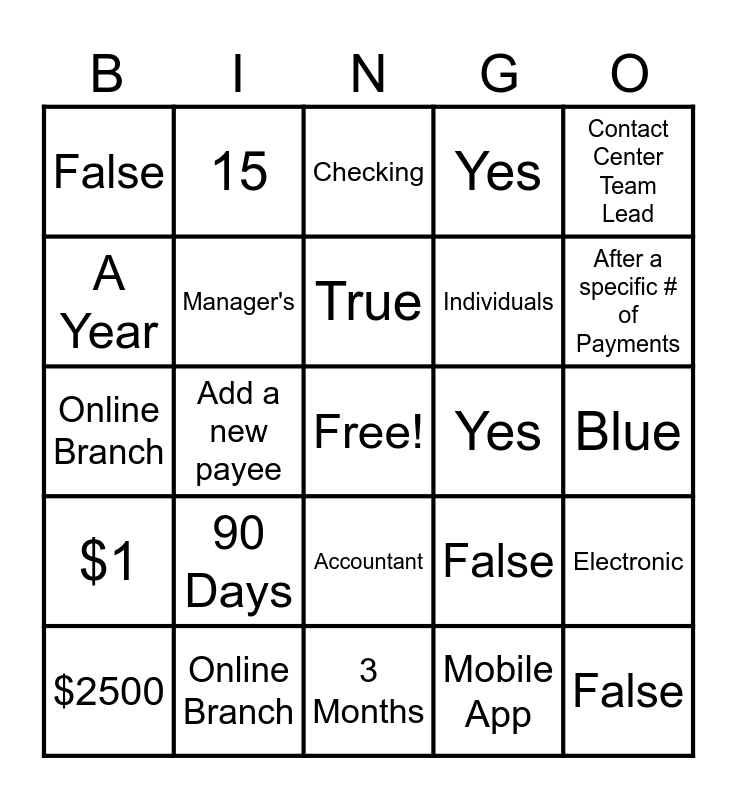 This bingo card has a free space and 28 words: Electronic, Electronic, Individuals, Mobile App, A Year, Checking, 15, $1, Yes, $2500, Online Branch, Yes, Online Branch, 3 Months, After a specific # of Payments, Yes, 90 Days, Manager's, True, Accountant, False, Via ACH, False, Add a new payee, Blue, False, Contact Center Team Lead and With a link to claim funds.