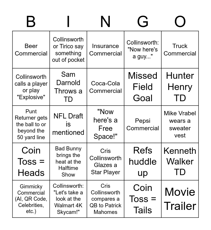 This bingo card has a free space and 59 words: Cris Collinsworth Chuckle™, Collinsworth: "Let's take a look at the Walmart 4K Skycam!", Collinsworth: "Let's take a look at... powered by AWS!", Coin Toss = Heads, Coin Toss = Tails, Terry McAulay is brought in to analyze a call, Sam Darnold Throws a TD, Drake Maye Throws a TD, Missed Field Goal, Blocked Punt, Collinsworth: "Now here's a guy...", Collinsworth calls a player or play "Dynamic", Collinsworth calls a player or play "Explosive", Collinsworth calls a player or play "Special", Collinsworth: "Take a look at this/that!", Beer Commercial, Movie Trailer, Truck Commercial, Doritos Commercial, Coca-Cola Commercial, Pepsi Commercial, Insurance Commercial, Gimmicky Commercial (AI, QR Code, Celebrities, etc.), Kenneth Walker TD, Rhamondre Stevenson TD, Cooper Kupp is called a "veteran presence", Jaxon Smith-Njigba TD, Stefon Diggs TD, Hunter Henry TD, A player gets their helmet knocked off, You laugh when you realize how Kayshon Boutte's last name is pronounced, Fumble, Interception, Mike Tirico is interrupted by Cris Collinsworth, Collinsworth or Tirico say something out of pocket, Collinsworth goes on a non-football tangent, San Francisco Postcard Shot™, NFL Draft is mentioned, Collinsworth: "I liked [insert player] coming out of the draft.", Punt Returner gets the ball to or beyond the 50 yard line, A coach or player is caught swearing on the mic, Bad Bunny brings the heat at the Halftime Show, Mike Vrabel wears a sweater vest, Mike McDaniel pats a player on the helmet, Drake Maye gets sacked, Sam Darnold gets sacked, Cris Collinsworth mentions the Chiefs, Collinsworth: "I'm not going to sugarcoat it.", Cris Collinsworth Glazes a Star Player, Cris Collinsworth compares a QB to Patrick Mahomes, NBC plugs a show that will air after the game, Fanduel Commercial, Crying Fan or Player, Cutaway to a random celebrity at the game, Tax Commercial, Refs huddle up, Roughing the Passer Penalty, Holding Penalty and Intentional Grounding Penalty.