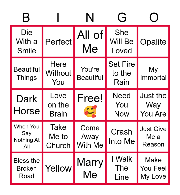 This bingo card has a free space and 24 words: Take Me to Church, Yellow, You're Beautiful, Bless the Broken Road, Opalite, Die With a Smile, Beautiful Things, Perfect, Need You Now, Come Away With Me, Set Fire to the Rain, Dark Horse, Crash Into Me, Just Give Me a Reason, Here Without You, I Walk The Line, Just the Way You Are, All of Me, My Immortal, Love on the Brain, Make You Feel My Love, When You Say Nothing At All, She Will Be Loved and Marry Me.