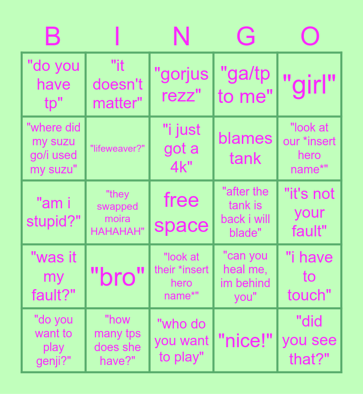 This bingo card has a free space and 24 words: "bro", "how many tps does she have?", "i just got a 4k", "do you want to play genji?", "girl", "do you have tp", "where did my suzu go/i used my suzu", "it doesn't matter", "after the tank is back i will blade", "look at their *insert hero name*", blames tank, "am i stupid?", "can you heal me, im behind you", "i have to touch", "lifeweaver?", "nice!", "it's not your fault", "gorjus rezz", "look at our *insert hero name*", "they swapped moira HAHAHAH", "did you see that?", "was it my fault?", "ga/tp to me" and "who do you want to play".