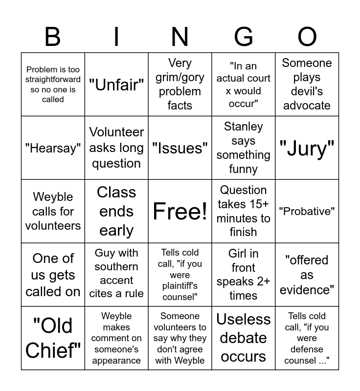 This bingo card has a free space and 24 words: Guy with southern accent cites a rule, Weyble makes comment on someone's appearance, "Issues", "Old Chief", Someone plays devil's advocate, Problem is too straightforward so no one is called, "Hearsay", "Unfair", Question takes 15+ minutes to finish, Tells cold call, "if you were plaintiff's counsel", Stanley says something funny, Weyble calls for volunteers, Girl in front speaks 2+ times, "offered as evidence", Volunteer asks long question, Useless debate occurs, "Probative", Very grim/gory problem facts, "Jury", Class ends early, Tells cold call, "if you were defense counsel ...", One of us gets called on, "In an actual court x would occur" and Someone volunteers to say why they don't agree with Weyble.