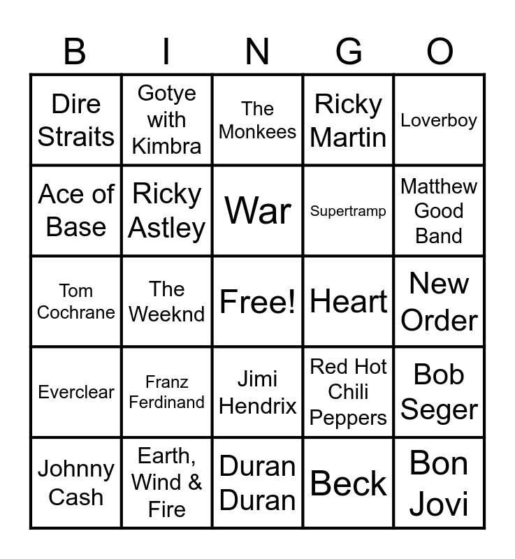 This bingo card has a free space and 50 words: Whitney Houston, Bon Jovi, AC/DC, Duran Duran, Franz Ferdinand, The Killers, Gotye with Kimbra, Shania Twain, Ace of Base, Abba, Ricky Astley, Ricky Martin, Bob Seger, Red Hot Chili Peppers, The Tragically Hip, April Wine, War, Heart, Thin Lizzy, Loverboy, The Weeknd, Beck, Dire Straits, Supertramp, Oasis, U2, Matthew Good Band, Finger Eleven, The Monkees, Jimi Hendrix, Our Lady Peace, Kenny Loggins, A-ha, Dexys Midnight Runners, Earth, Wind & Fire, Salt N Pepa, Madonna, Billy Idol, Cyndi Lauper, New Order, Fatboy Slim, The Knack, Huey Lewis & The News, Metric, Johnny Cash, Tom Cochrane, Beastie Boys, Three Days Grace, Everclear and Benson Boone.