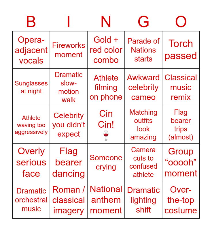 This bingo card has a free space and 24 words: Flag bearer dancing, Roman / classical imagery, Athlete filming on phone, Dramatic orchestral music, Torch passed, Opera-adjacent vocals, Sunglasses at night, Fireworks moment, Matching outfits look amazing, Someone crying, Awkward celebrity cameo, Athlete waving too aggressively, Camera cuts to confused athlete, Group “ooooh” moment, Dramatic slow-motion walk, Dramatic lighting shift, Flag bearer trips (almost), Gold + red color combo, Classical music remix, Celebrity you didn’t expect, Over-the-top costume, Overly serious face, Parade of Nations starts and National anthem moment.
