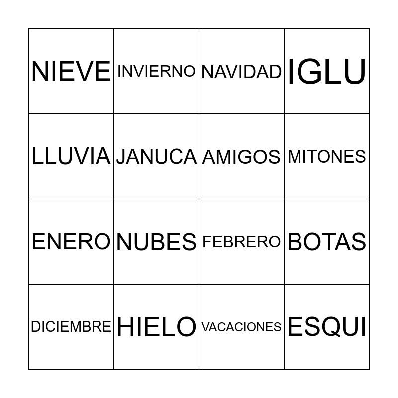 This bingo card has 16 words: HIELO, BOTAS, NAVIDAD, NIEVE, ENERO, INVIERNO, FEBRERO, VACACIONES, LLUVIA, JANUCA, DICIEMBRE, IGLU, NUBES, MITONES, AMIGOS and ESQUI.